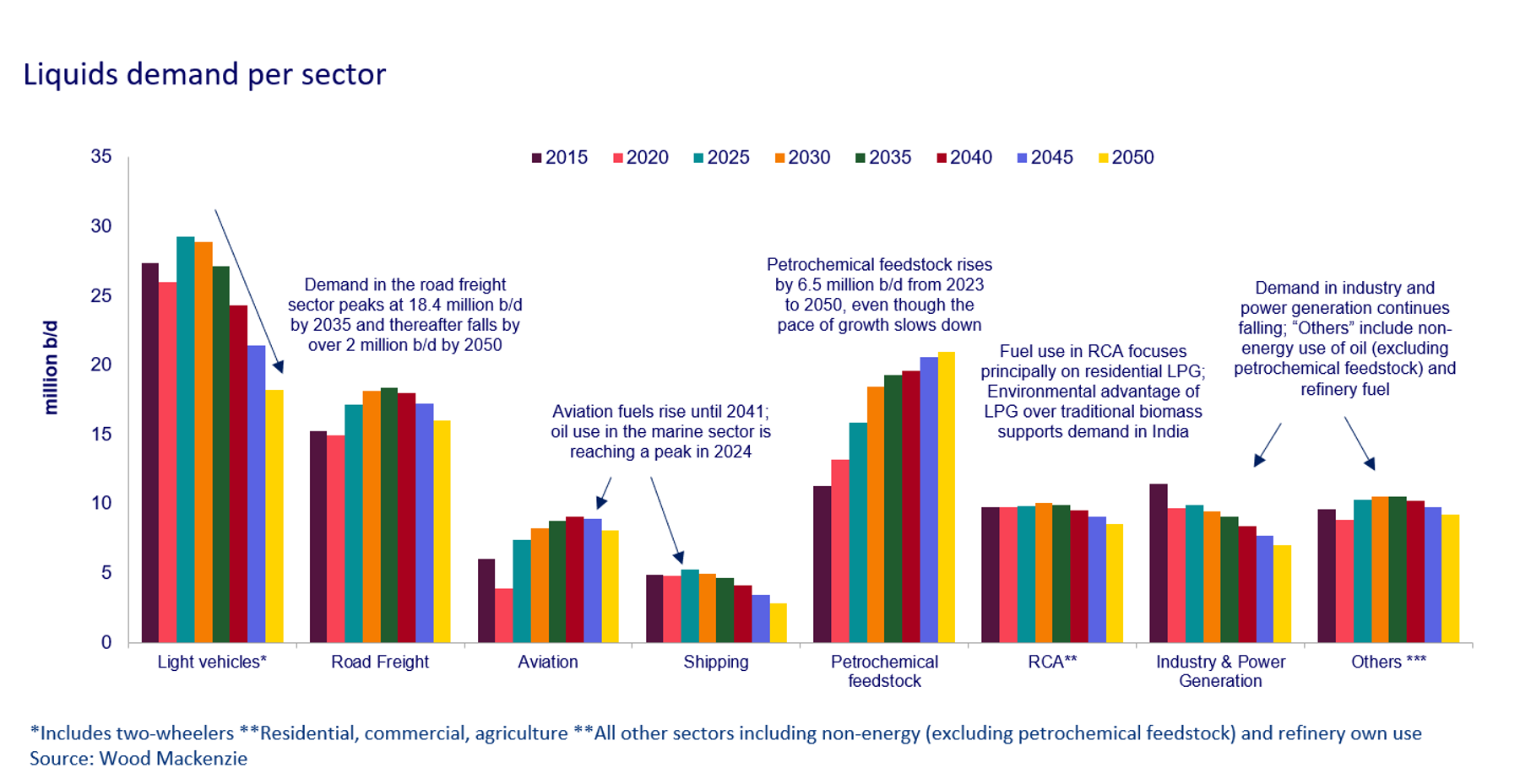 For our long-term forecast, we assess demand by sector and then break it down by refined product or liquid. The sectors include light vehicles, road freight, aviation, shipping, petrochemical feedstock, residential, commercial and agriculture and industry/power generation. There is an ‘others’ category that includes non-energy use, such as bitumen for road construction, and refinery own-use fuel.