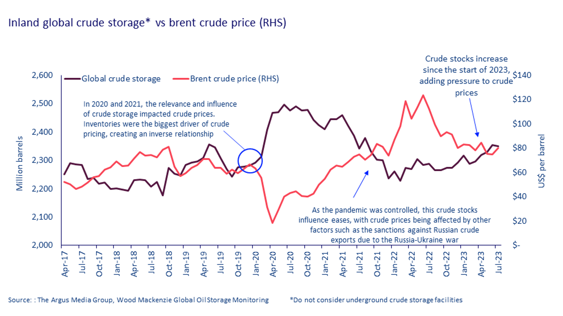 In 2020 and 2021, crude storage significantly impacted the price of oil, as demand was weak. Inventories heavily influenced crude pricing, and an inverse relationship resulted, with the Brent crude price plummeting and crude storage volumes peaking around the world. As the pandemic came under control, the crude stocks influence lessened, and crude prices were impacted by other factors, including the sanctions against Russian crude exports during the Russia-Ukraine war. In the first half of 2023, crude stocks have increased, but US commercial stocks are declining in Q3 which is adding to the pressure on prices. This is outlined in the chart below.