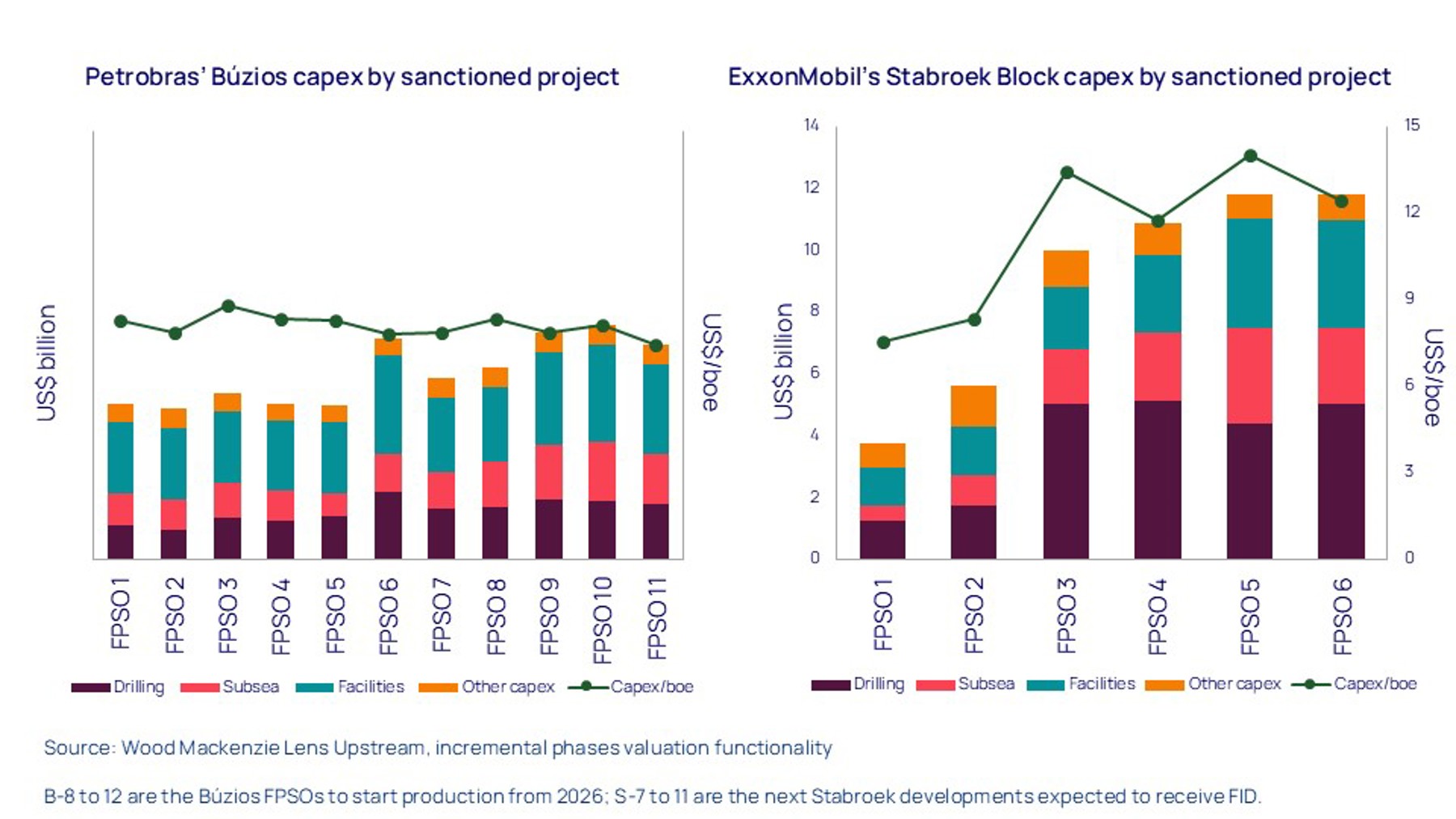 One key element is the procurement of floating production storage and offloading (FPSO) vessels. While Petrobras has commissioned bespoke facilities from multiple suppliers for Búzios, ExxonMobil’s adoption of 70-80% standard topsides and its commitment to SBM as preferred FPSO supplier allows it to start construction much earlier. This results in lead times that are up to a year shorter from final investment decision (FID) to first oil for ExxonMobil.