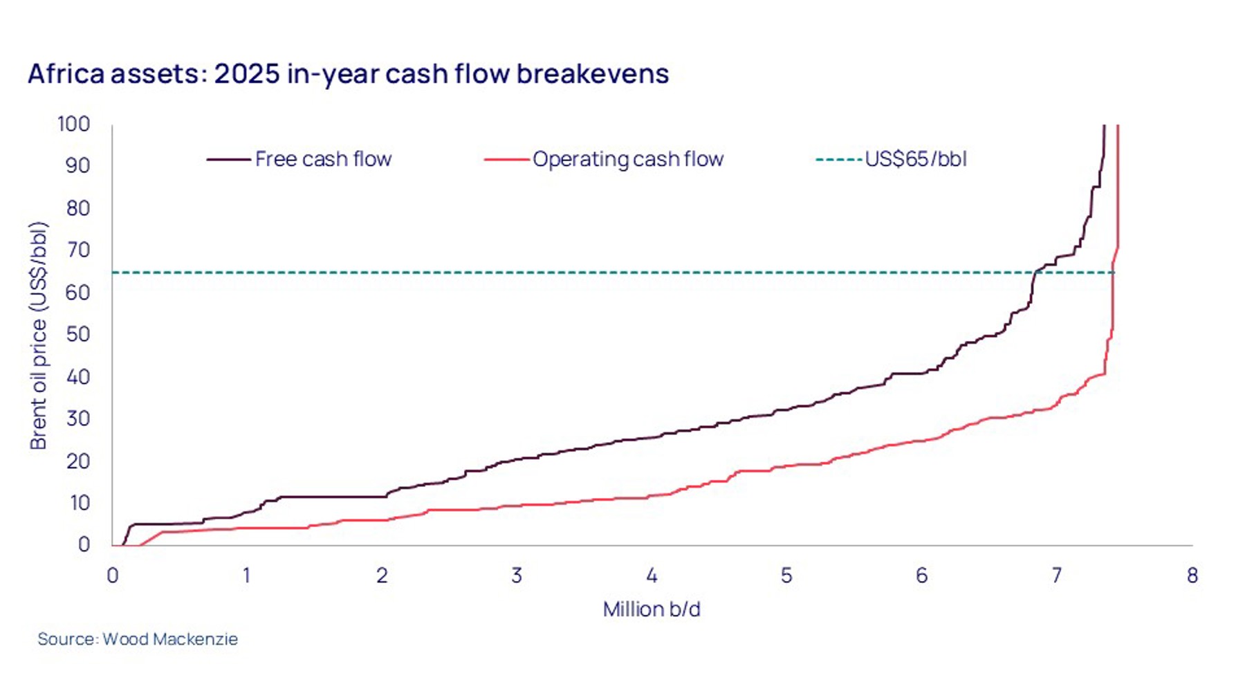 Price pressure will squeeze Africa cashflows, likely creating an activity slowdown. Capital-intensive greenfield projects and high-cost late-life assets are particularly at risk. We estimate that around 8% of current regional production doesn’t cover investment costs at US$65 per barrel.