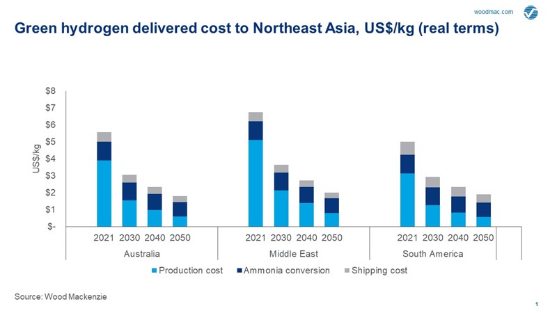 Critical to the success of all green hydrogen projects will be renewable electricity costs. Wood Mackenzie’s APAC Power & Renewables team estimate Australia’s levelised cost of electricity (LCOE) for solar photovoltaic (PV) power has already fallen 80% to US$ 50/MWh in the last decade and is projected to be less than US$ 20/MWh range by 2050. This is comparable to that of other sun-rich countries, including Saudi Arabia, Chile and Brazil, and way below renewables costs in future export markets such as Japan.