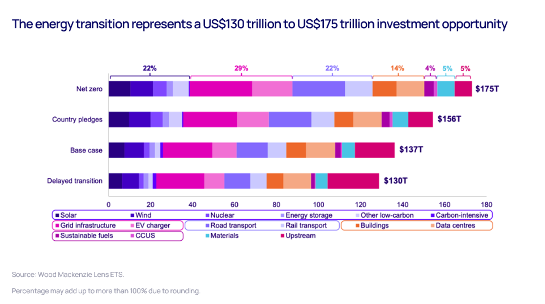 Based on our analysis of these possible pathways, the energy transition presents an immense US$130 trillion to US$175 trillion investment opportunity globally between now and 2060. Under the net zero pathway, half of total capex would need to go to electrification and infrastructure (see chart below). Mature technologies will dominate overall spend, as policy makers prioritise cost efficiency and supply security.