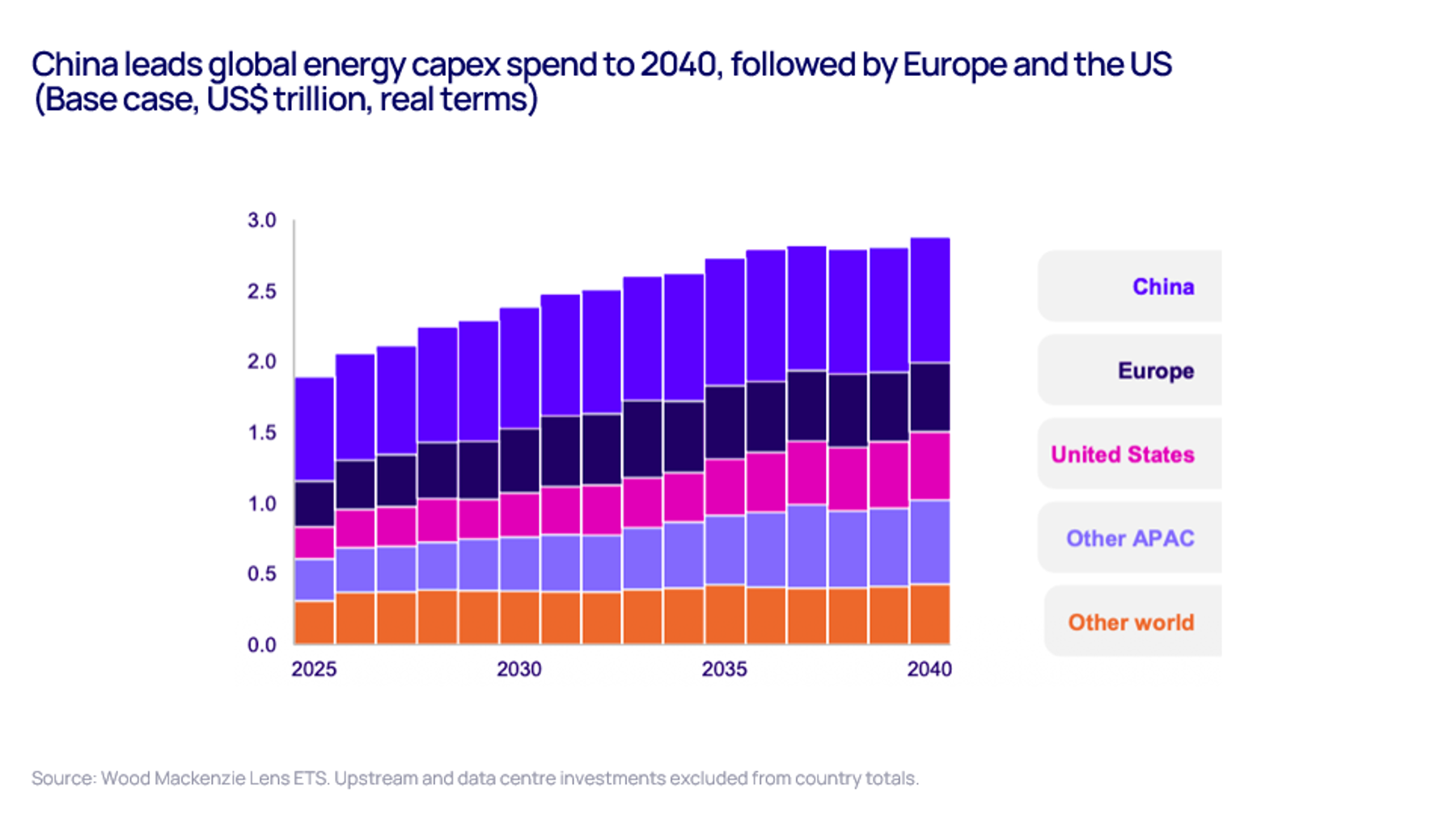 Under our base case, China, Europe and the US account for 70% of global capex to 2040 between them (see chart below). China alone will invest 30% of total global capex, focusing on power expansion, electrification and efficiency to target lower costs and ensure supply security.