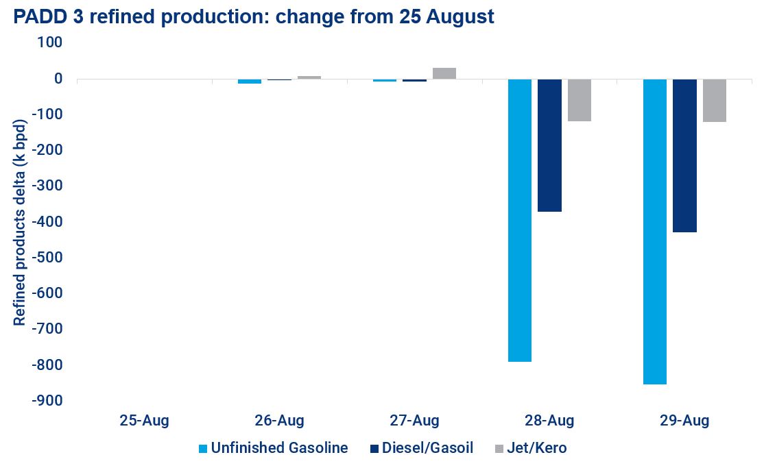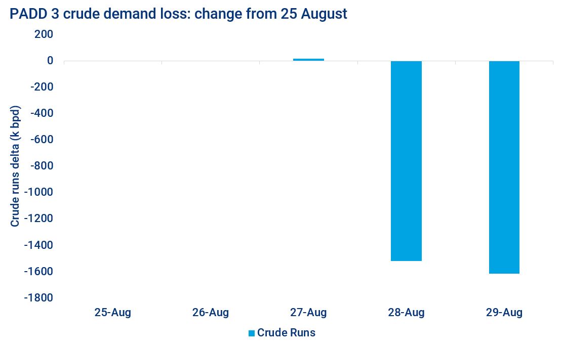 PADD 3 crude runs decreased 1.568mn bpd to a total of 7.198mn bpd on Saturday, 28 August. Total Gulf Coast crude runs fell a further 94,000 bpd on Sunday, 29 August. Unfinished gasoline, diesel/gasoil, jet/kero refined fuel production decreased 781,000 bpd, 365,000 bpd and 151,000 bpd, respectively, on Saturday with further decreases on Sunday, according to our Refinery I/O service.