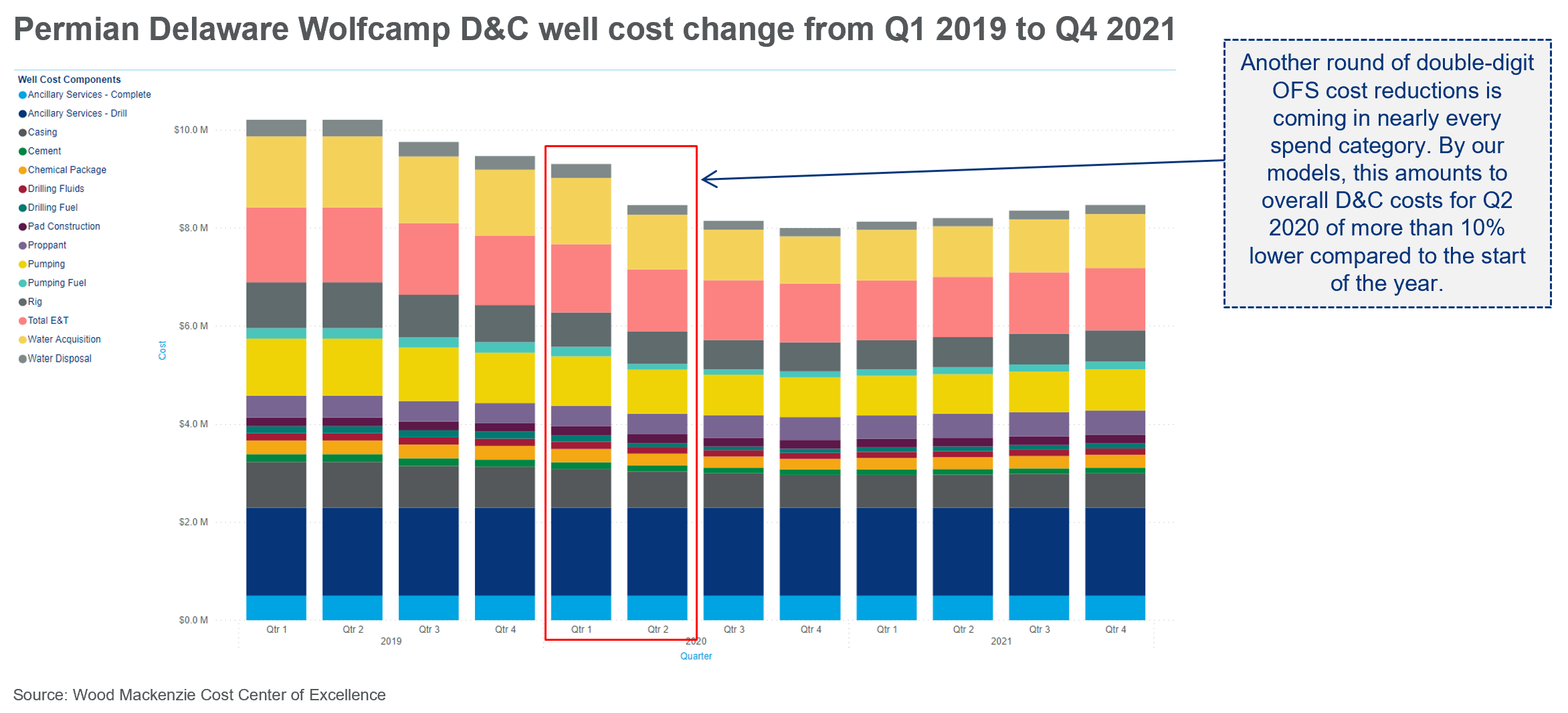 But another round of double-digit cost reduction is coming in nearly every spend category. Overall drilling and completion costs for the second quarter were more than 10% lower when compared to the start of 2020. Expect another double-digit reduction before bottoming out in Q4 this year. While activity will start to pick up again in 2021, it’s unlikely that costs will recover to today’s levels.