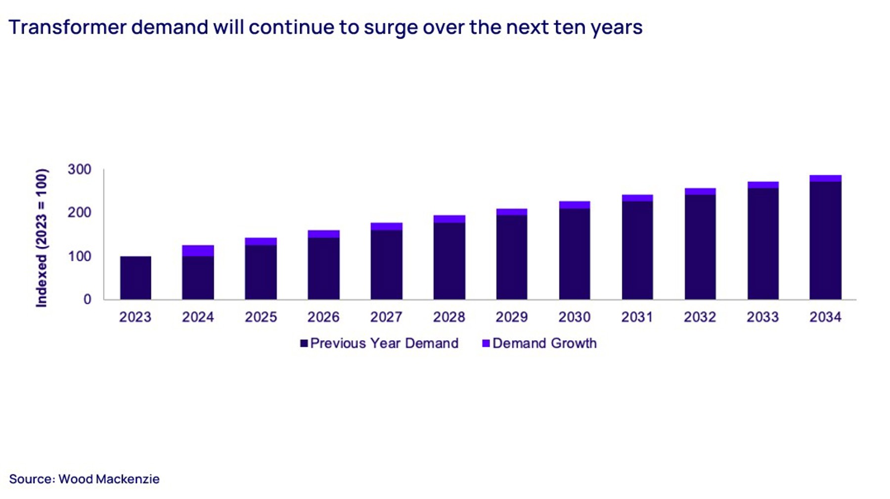 New electricity uses, from EV charging to data centres, are driving a sustained and ongoing increase in electricity demand for the first time in many years. Electricity networks need to be modernised and expanded to address this rapid increase in load. Inevitably, that means demand for key equipment is rising. To take one key example, we estimate that global demand for transformers will almost triple by 2034 (see chart below).