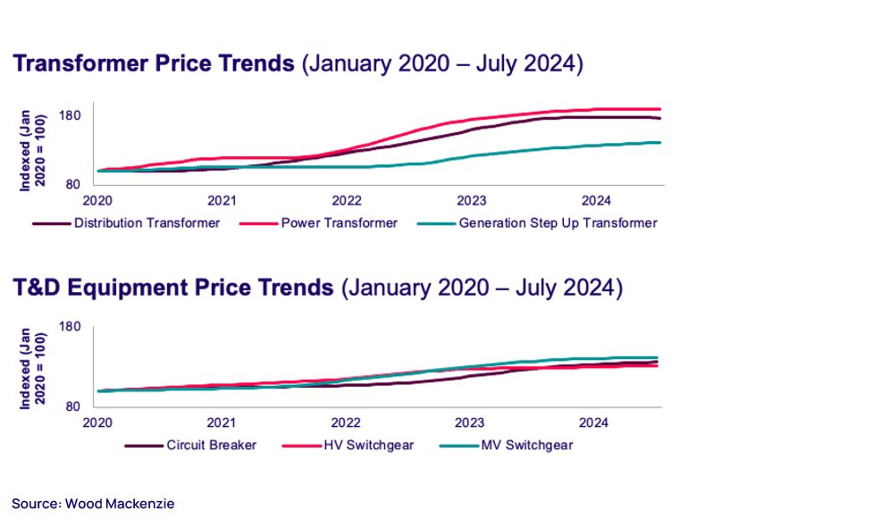 The direct result of the growing disparity between supply and demand is that the price of key equipment including transformers, circuit breakers and switchgear is soaring (see charts below).