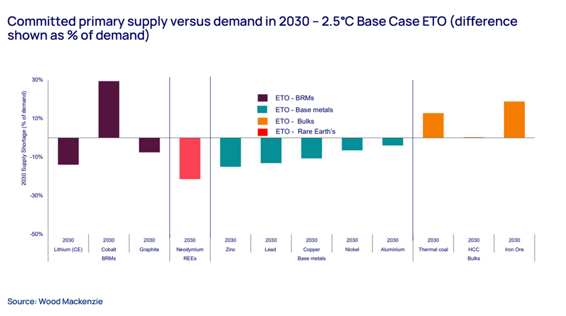 In fact, if we don’t see an investment of US$200bn in primary metals supply, demand destruction will likely occur. Lack of investment and slow lead times on metals development, together with a lag in the right skills and capabilities means that meeting our net zero 2050 scenario demand becomes an impossibility. Instead, it would take US$400bn of investment to turnaround the prediction that by 2030 committed primary supply versus demand will amount to our 2.5°C base case energy transition outlook (ETO).