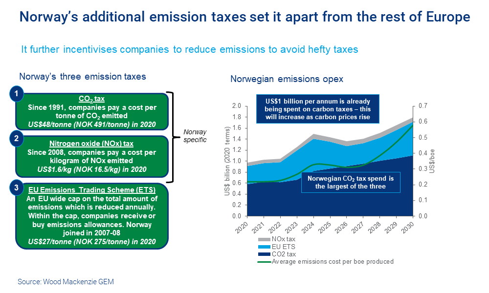 For example, Equinor, Lundin Energy and Aker BP’s Utsira High project, which will power ten fields with electricity from shore and save around 1.15 million tonnes of CO2 per year, can generate a return greater than 10% under our base assumptions. However, Norway’s unique carbon tax system is critical in achieving this.
