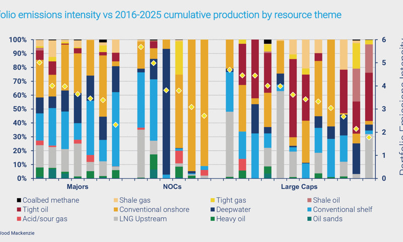 Since different resource themes such as LNG, heavy oil, or deepwater, demonstrate significantly different emissions intensities, a company’s balance of asset types can significantly affect its overall emissions intensity.