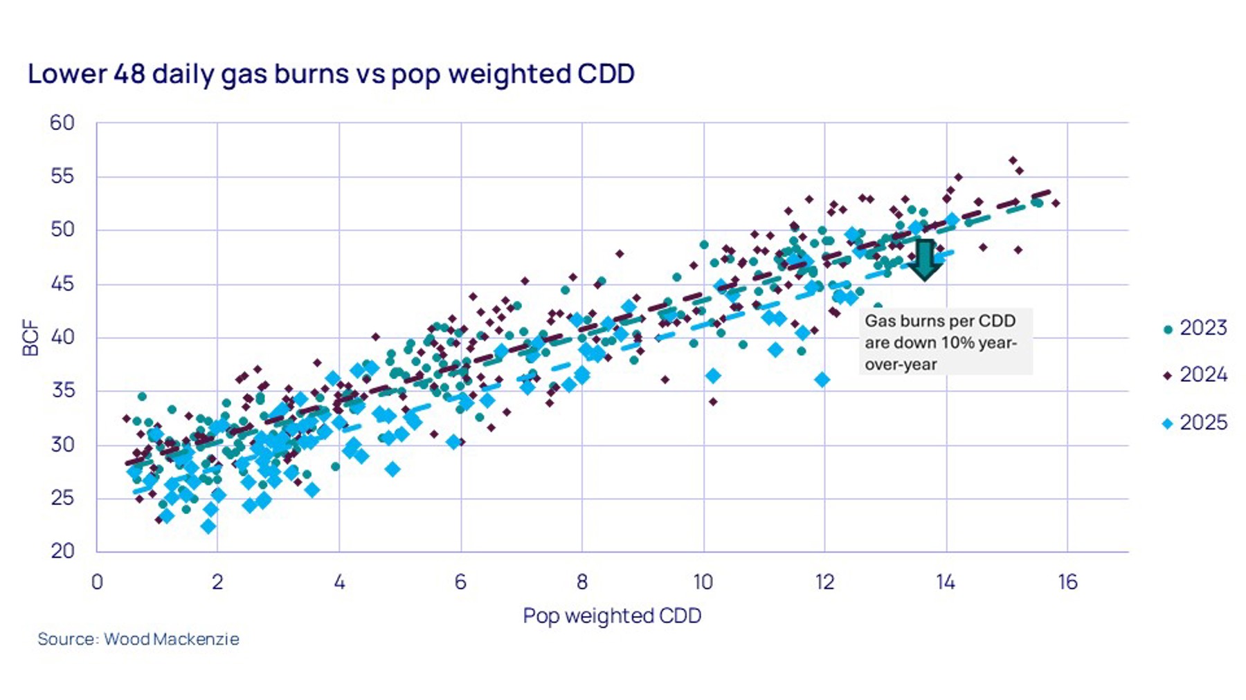 However, while overall load is up, gas burns for power generation are down about 10 percent per CDD compared to last year. This disconnect is critical.