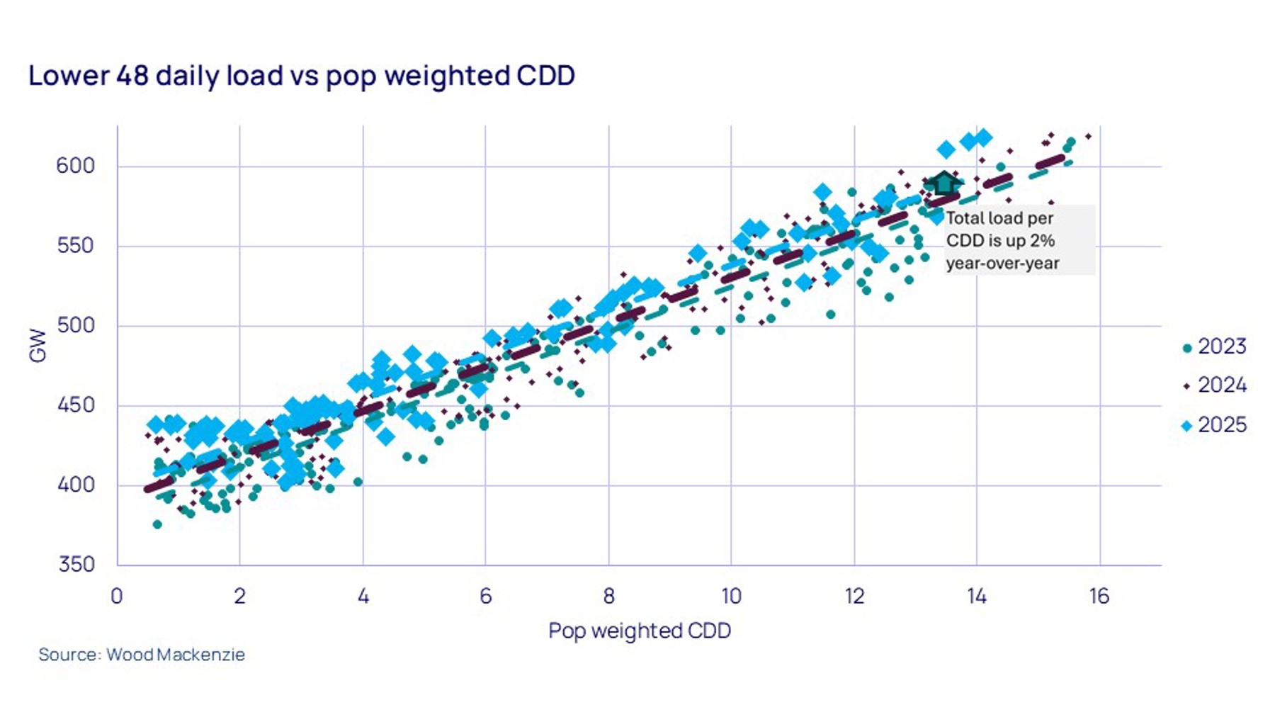 Power demand has been growing steadily, driven in part by booming data center load. On a cooling degree day (CDD) basis, total load is up roughly 2 percent compared to summer 2024, matching forecasts.