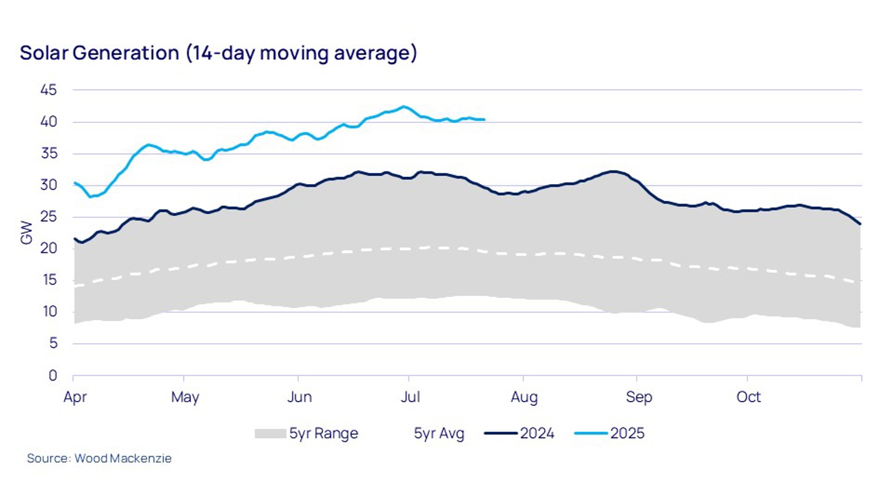 Wind generation was strong in Q2, with output exceeding 2024’s highs, and this trend has continued into Q3, further limiting gas-fired generation.