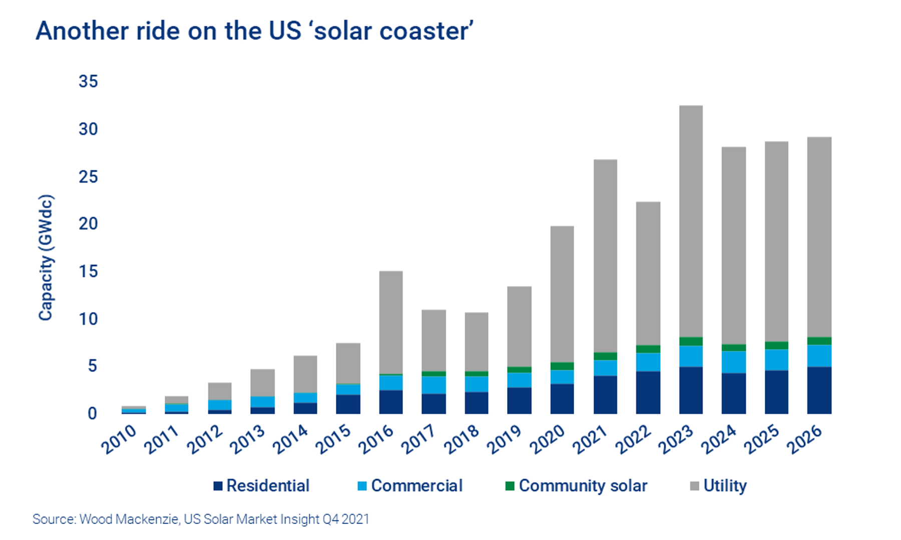The solar market has never experienced this many opposing dynamics. As a result, Wood Mackenzie is forecasting the biggest fluctuations in near-term solar capacity since 2016, when the investment tax credit almost expired. It’s the solar coaster like we’ve never seen it before.