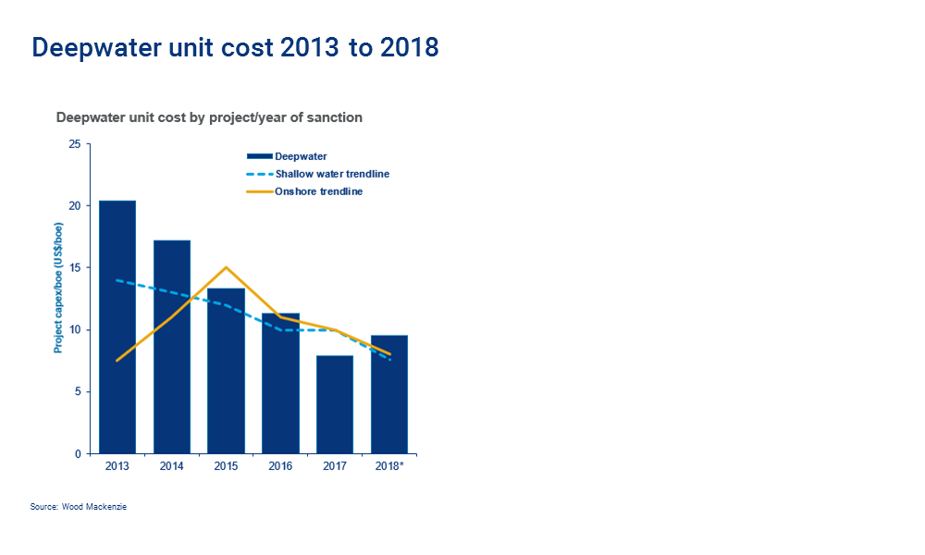 2018’s deepwater cost curve is lower and longer, with unit costs down by more than 50% since 2013.