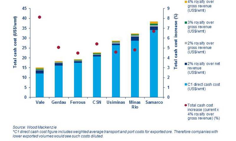 Most Brazilian mines are conveniently placed on the low-end of our 2017 CFR China cash cost curve. This is largely driven by Vale's high-grade-low-cost deposits and its integrated logistics system. The company's 2018 FOB total cash cost is forecast to be US$13.9/wet tonne, with royalties and levies representing 11.5% with the current royalty model. But the game may change shortly. Applying a 2%, a 3% and a 4% royalty charge over gross revenue scenarios, Vale's FOB cash cost may range from as low as US$14.1/wet tonne to as high as US$15/wet tonne, which would represent an 8.1% increase in the miner's costs! Other producers will see their cost competitiveness impacted to different degrees. Like Vale, Samarco may see a 6.7% cash cost increase if the worst case scenario is applied. Ferrous is likely to be the less impacted one as it sells a lower-grade itabirite product with high levels of silica, meaning it does not get the same high premium as other producers.