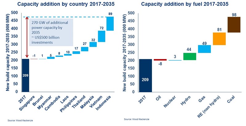 The region has installed power capacity of 210 GW in 2017. We estimate that an additional 270 GW of new capacity is needed by 2035. This translates to an estimated investment of US$500 billion in power assets alone. With the region lacking the internal capital, it becomes a strong magnet for foreign direct investments.