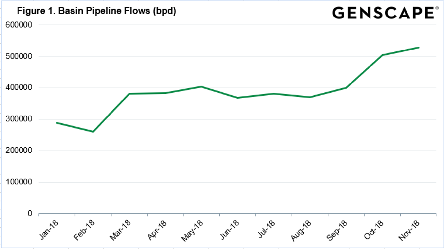 Figure 1. Plains' Basin pipeline surpassed 500,000 bpd beginning October 2018, following an expansion