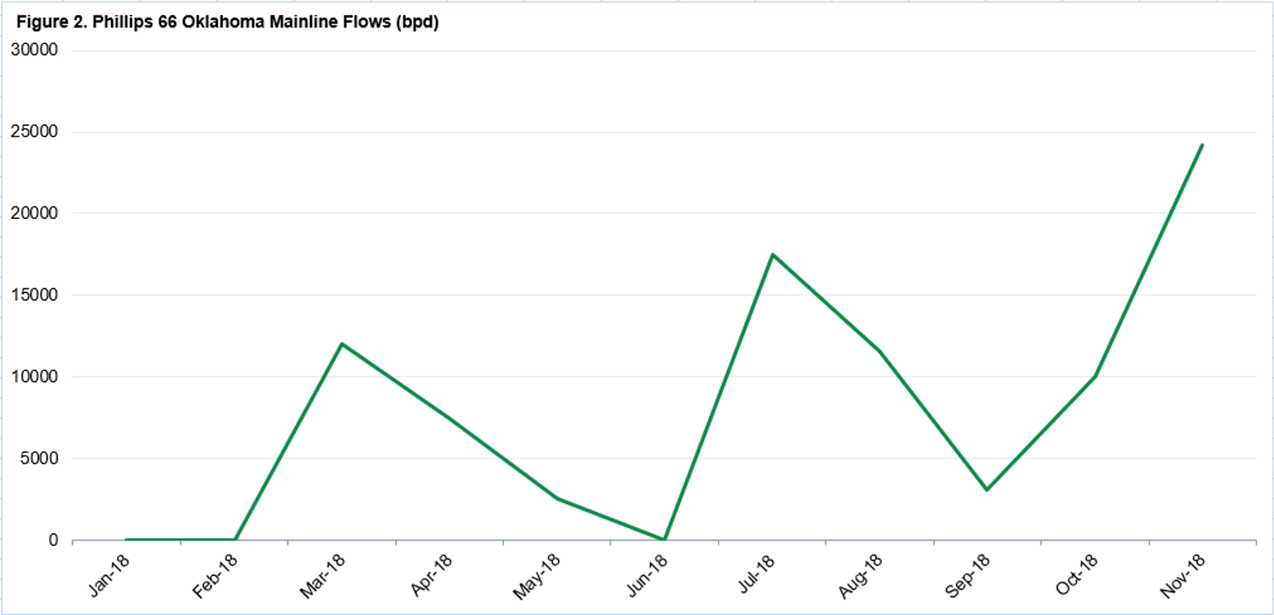Phillips 66's 100,000 bpd Oklahoma Mainline, which flows from Wichita Falls to its 203,000 bpd Ponca City, OK, refinery, averaged just over 6,000 bpd in 2018 prior to October 2018, when Sunrise came online, according to the Railroad Commission of Texas (TxRRC) filings. In November 2018, average flow reached almost 25,000 bpd.