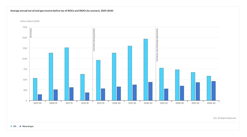 One thought-provoking chart in the IEA report showed expected earnings for international and national companies from oil and gas out to 2040. The really sobering set of bars is on the righthand side, showing the IEA’s Sustainable Development Scenario, consistent with achieving the Paris Agreement goal of limiting the rise in global temperatures to well below 2°C. In that world, profits from gas are expected to be healthy and growing, while profits from oil fall.