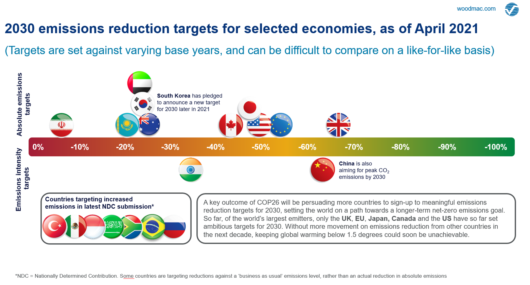 Many economies have responded to that call. This chart shows a selection of the most significant objectives for 2030. Above the line are the goals for absolute reductions in emissions, and below it are the ones framed in terms of emissions intensity.