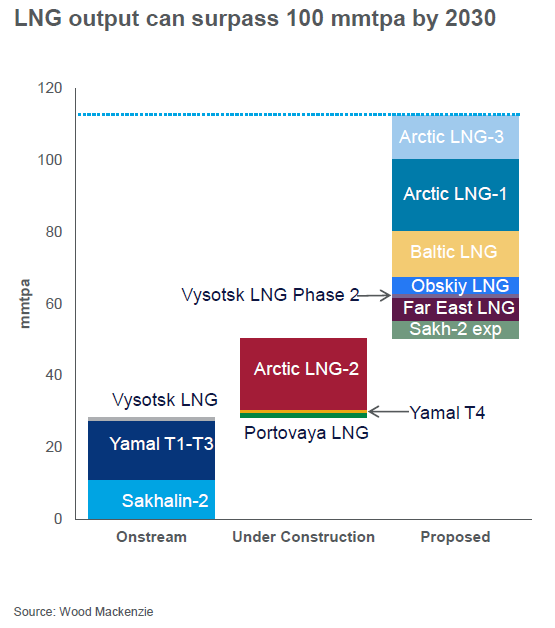 Russia is betting on gas as an energy transition fuel in Europe and Asia to create demand for its growing production. The Ministry of Energy has set ambitious targets for natural gas – Russia’s most conservative energy transition scenario calls for 750 bcma of gas production and about 250 bcma of exports by 2035. New LNG projects will help achieve those targets.