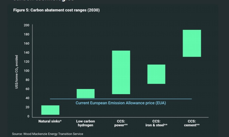 This comes from the latest in our Horizons series analysing the big subjects in energy and natural resources. The report, by Murray Douglas, a research director in the Europe gas team, looks at the EU’s hugely ambitious goal of cutting greenhouse gas emissions by 55% by 2030, as a milestone on its road to net zero by 2050. One of the crucial conclusions on achieving that objective is that the price of carbon will have to be significantly higher than it is today. For deep decarbonisation, technologies including low-carbon hydrogen and carbon capture in the power, steel and cement industries will have to be widely used. But as this chart shows, even at their lowest estimated costs, these technologies generally need carbon prices higher than their current levels in the EU’s emissions trading system.