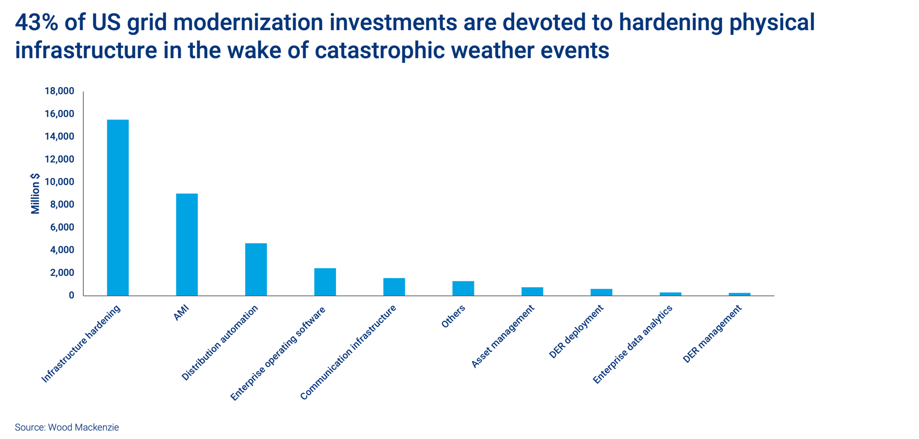 Regional variation is significant, too. While the Southeast is hardening its physical infrastructure to withstand hurricanes, the Northeast is busy implementing AMIs to shape prosumer behaviors. California, as the top electrification market, is making the highest level of investment in DER deployment and management.