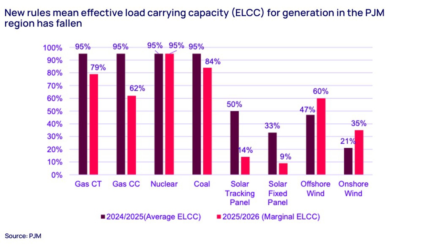 PJM’s capacity used to be calculated based on average effective load carrying capacity (ELCC). However, in order to reflect generating resources’ real capabilities to contribute to grid stability in severe circumstances, marginal ELCC was adopted for accreditation for the 2025-2026 auction. For most resources this resulted in a noticeable downgrading of capacity (see chart below). The shrinkage in supply as a consequence was reflected in bidding behaviour in the auction.