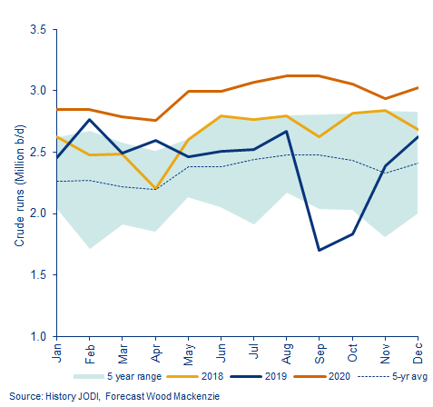 For Asia’s refiners and petrochemicals producers, the spike in crude oil prices will dent margins further. As an additional thought, a prolonged outage and/or further upside above-ground risks in the near term could have an impact on the preparation ahead of the IMO marine bunker specifications change, though it’s still early to assess the full impact.