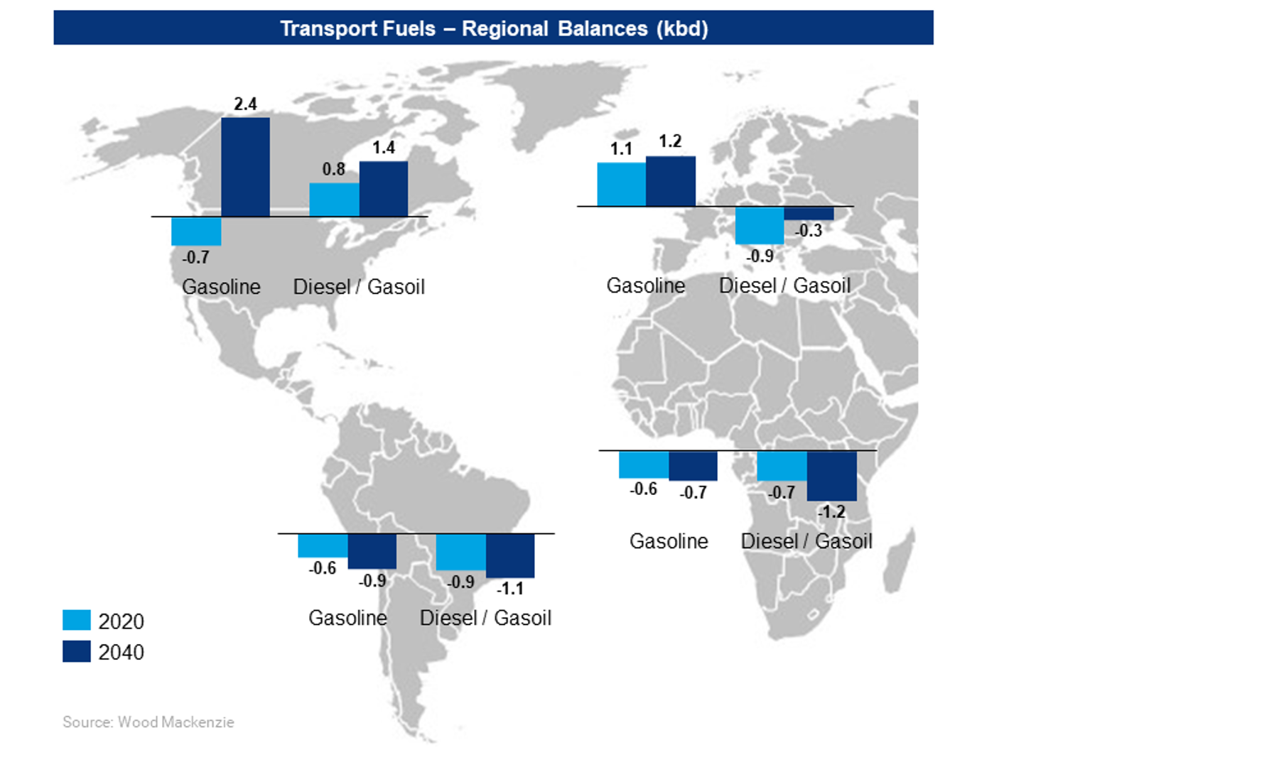- Latin America is already short of transportation fuels by ~1.5 MMbpd. This equates to around a third of the demand. And as demand grows we expect this imbalance to increase to ~2 MMbpd by 2040.