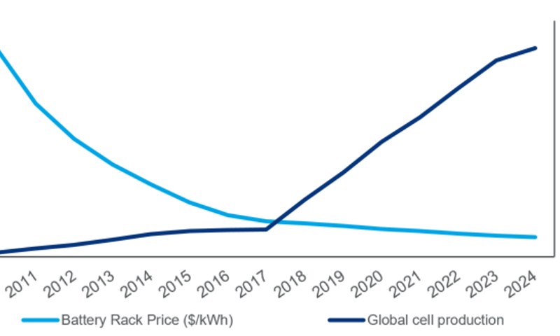 The cost of a lithium-ion battery rack for a storage system has dropped by 85% since 2010.