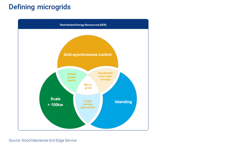 Microgrids are a set of distributed energy resources (DER) with unique capabilities. Wood Mackenzie defines a microgrid as a set of distributed energy resources with the following features: