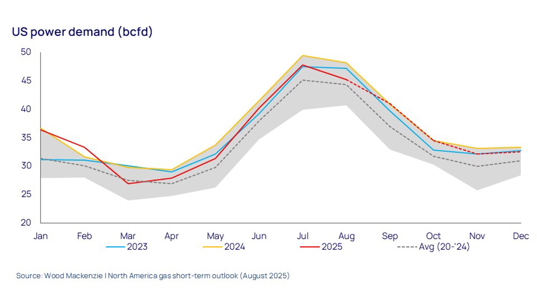 As the peak cooling season comes to an end, new data shows that US gas-fired power generation remained lower year on year, even as total electricity demand increased. Despite relatively average summer temperatures, gas usage in the power sector failed to match last year’s record highs. This reflects ongoing shifts in fuel economics and capacity additions that are likely to continue into autumn.