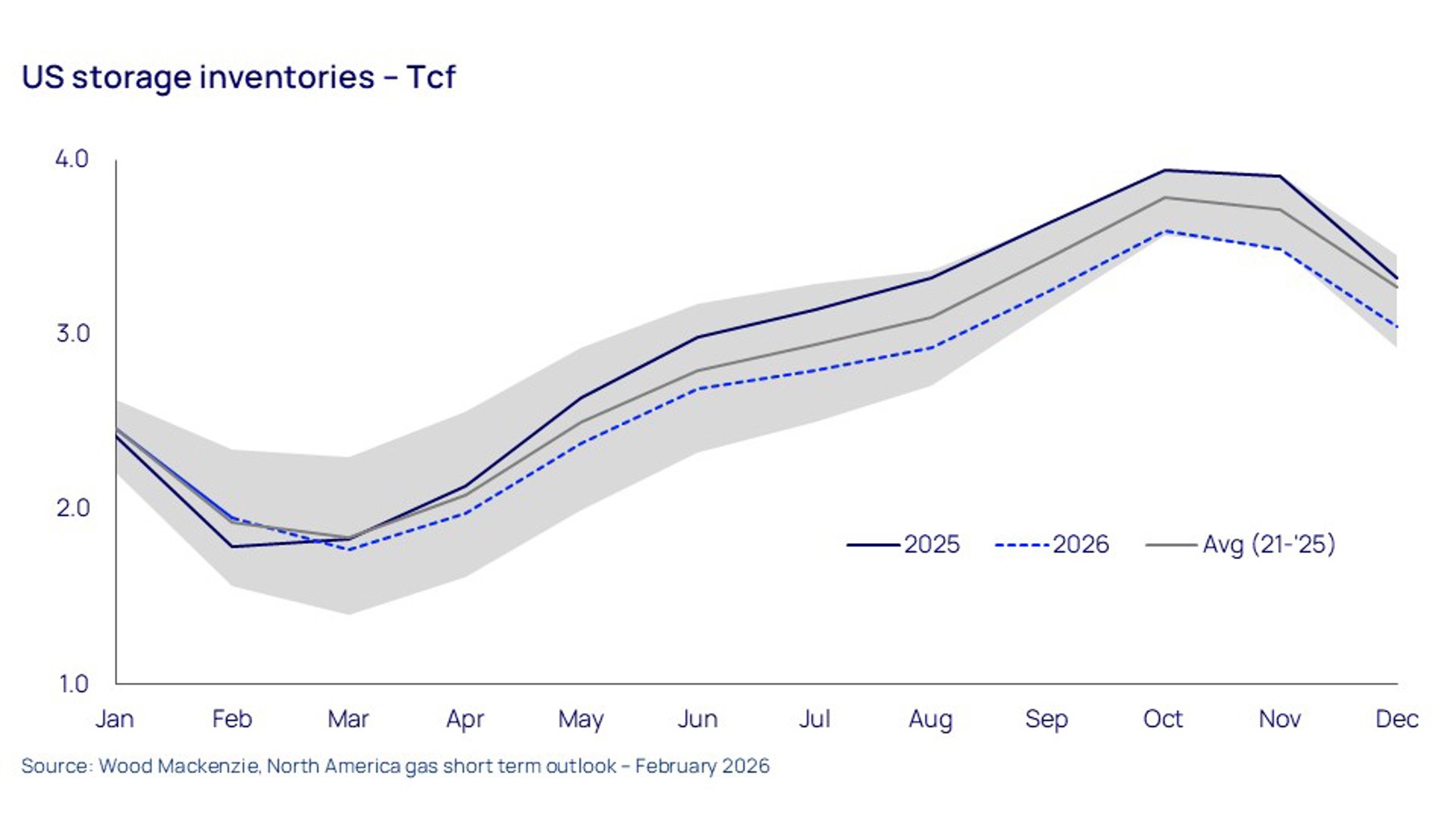 After peaking above $4.20/mmbtu on 30 January, Henry Hub futures for the 2026 summer strip have fallen nearly a dollar to around $3.25/mmbtu. In its February short-term outlook, Wood Mackenzie similarly revised its price expectations lower, reflecting the turn to widespread and sustained mild weather following Winter Storm Fern.