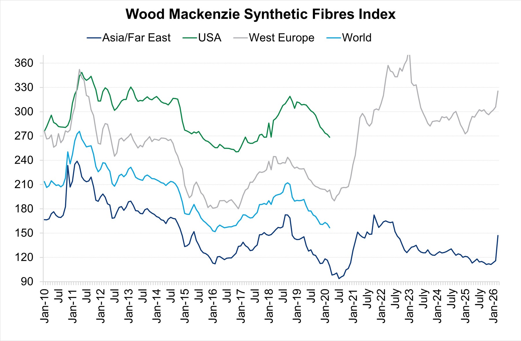 The table below gives a sample of the synthetic fibres index; more detail is available on request – please contact chemicals@woodmac.com for more information.