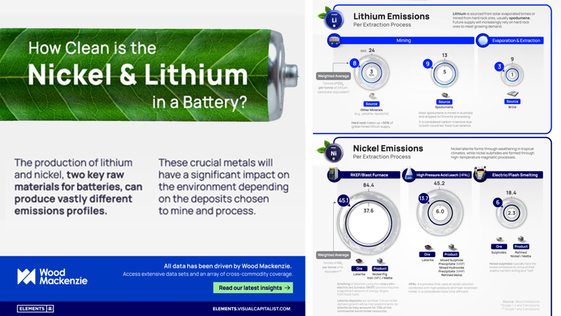 The production of lithium (Li) and nickel (Ni), two key raw materials for batteries, can produce vastly different emissions profiles. This downloadable graphic shows how nickel and lithium mining can significantly impact the environment, depending on the processes used for extraction.