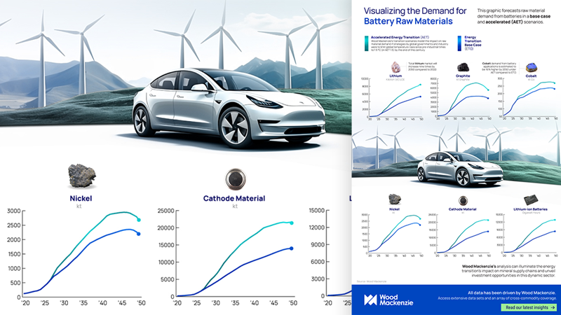 Download the full infographic to gain a visual understanding of the demand for battery raw materials in a base case and accelerated scenarios.