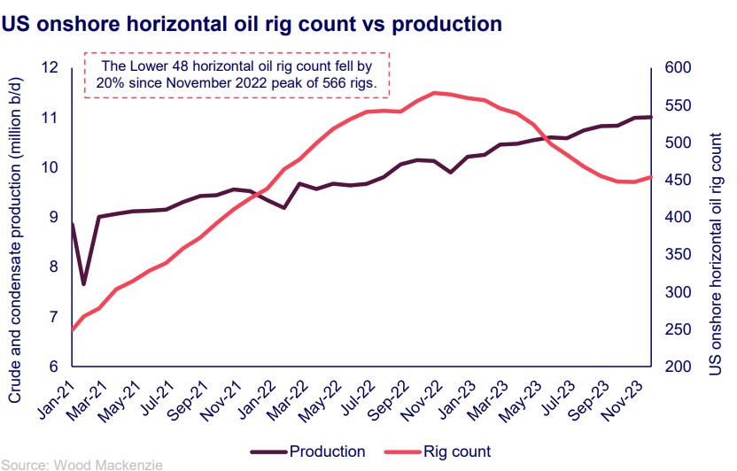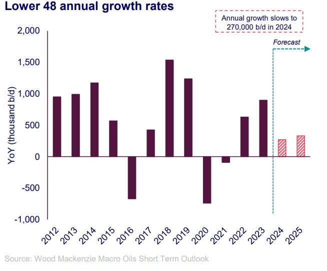 In its report “Is the Lower 48 tight oil supply boom over?” Wood Mackenzie projects Lower 48 oil production to grow by 270,000 b/d in 2024 and another 330,000 b/d in 2025.