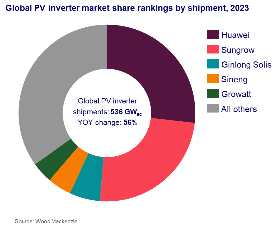 China was responsible for more than half of all global shipments, as the country’s solar demand doubled in 2023. Industry leaders Huawei and Sungrow extended their market dominance and retained their first and second positions in the rankings, respectively. Together they captured more than 50% of the global market, largely through the popularity of their utility-scale inverters.