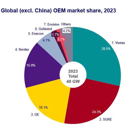 In comparison, 2023 was a disappointing year for western OEMs. Companies across Europe and the Americas suffered financial losses in a stalling wind market that plateaued at 40 GW capacity installed, a 3% drop YoY, which is the lowest year since the COVID-19 pandemic.