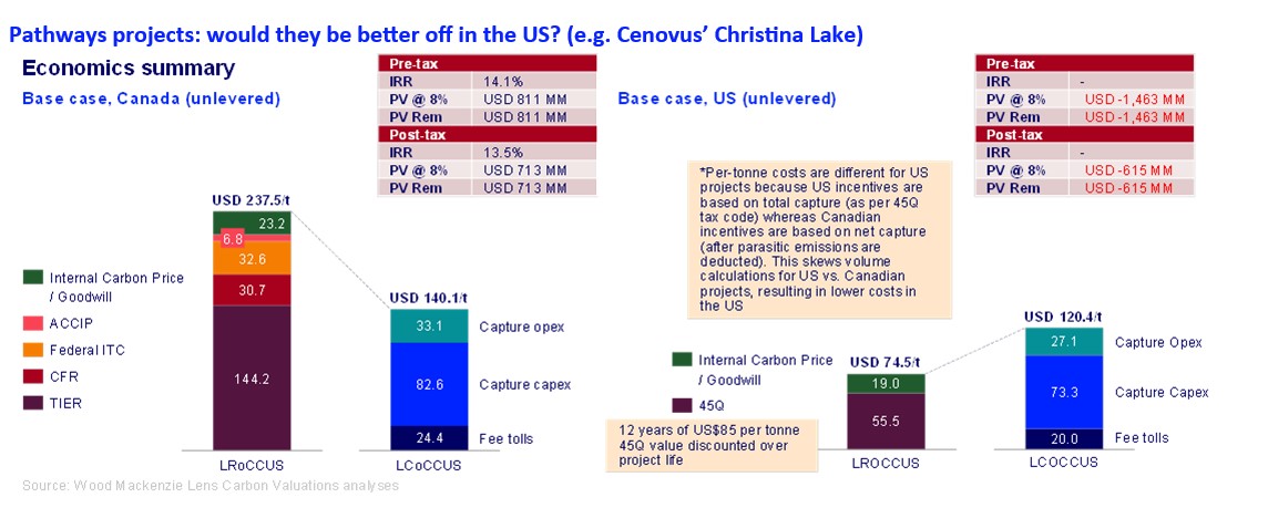 According to Wood Mackenzie, CCUS incentives in Canada are already much higher than in the US. In a hypothetical scenario where Cenovus’s proposed Christina Lake project is built in the US (and its economics juxtaposed with the Canadian project below), Wood Mackenzie’s analysis demonstrates that it would be much less economically attractive in its base case.