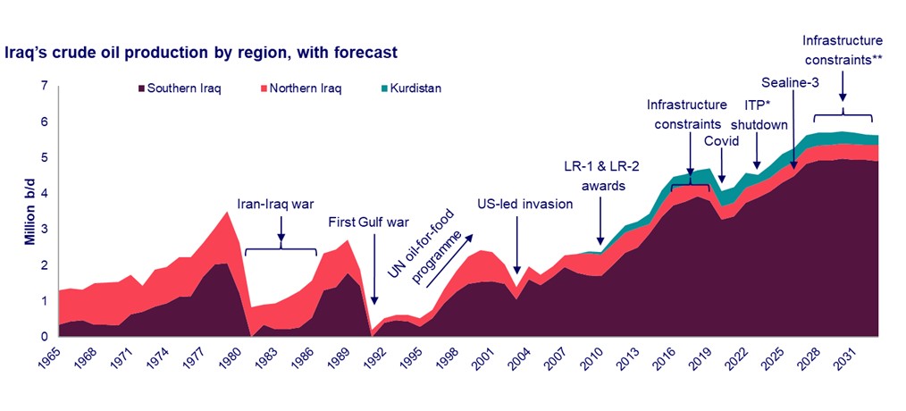 Source: Wood Mackenzie Lens. *Iraq-Turkey pipeline. **Without Sealine-4 and 5. Sealines are planned subsea pipelines connecting the Fao terminal to the Al Basra Oil Terminal and part of Iraq’s southern export infrastructure expansion projects.