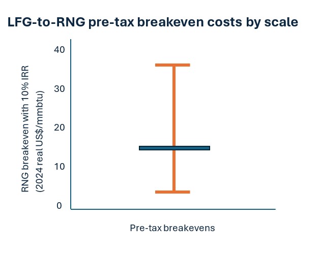 Landfill gas remains the most popular feedstock option for renewable gas production (LFG-to-RNG), but project pre-tax breakeven prices can range, with success relying heavily on location and scale, according to a new report from Wood Mackenzie.