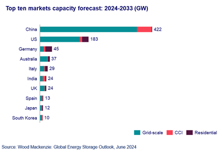 Annual capacity will increase from approximately 500 GW of new solar and wind capacity installed in 2023, and average 560 GW annually over the 10-year outlook. China will continue to dominate solar, energy storage, and wind uptake, with 3.5 TWac forecast to be grid-connected between 2024 and 2033.