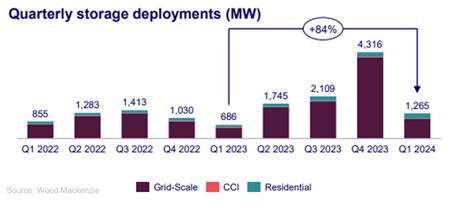 The U.S. energy storage market set a first-quarter record for capacity installed in Q1 2024, with 1,265 megawatts (MW) deployed across all segments. This marks the highest storage capacity ever installed in a first quarter in the U.S., representing an 84% increase from Q1 2023.