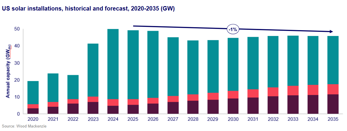 Leyva Martinez highlighted the steady growth trajectory for solar installations, with annual capacity additions expected to range between 41 GWdc and 50 GWdc from 2025 to 2035. However, she cautioned that policy uncertainty could significantly impact these projections.