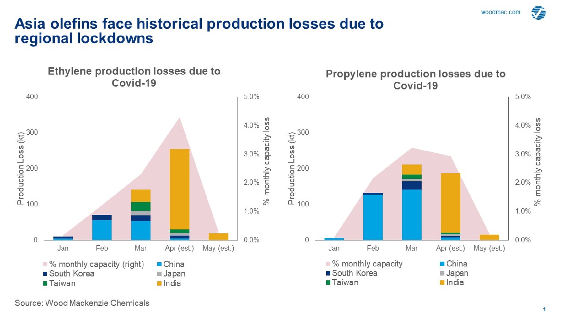 Wood Mackenzie principal analyst Catherine Tan said: “We estimate about 496 kilo-tonnes (Kt) of ethylene and 533 Kt of propylene production capacity to be lost between January and May as a result of declining refinery utilisation rates, and coronavirus containment measures across Asia. This is in addition to outages from planned maintenances.