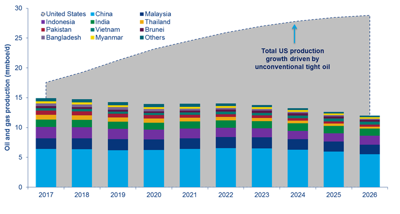 "Asia's top 20 upstream companies are heavily invested in conventional plays across the region, where fields are mature and production is set to decline 20% over the next decade," said Adrian Pooh, senior research analyst, Asia upstream. "On the other hand, output from the tight oil-driven US unconventional plays will grow exponentially over the same period, but their overall portfolio exposure to the theme is under 1%."