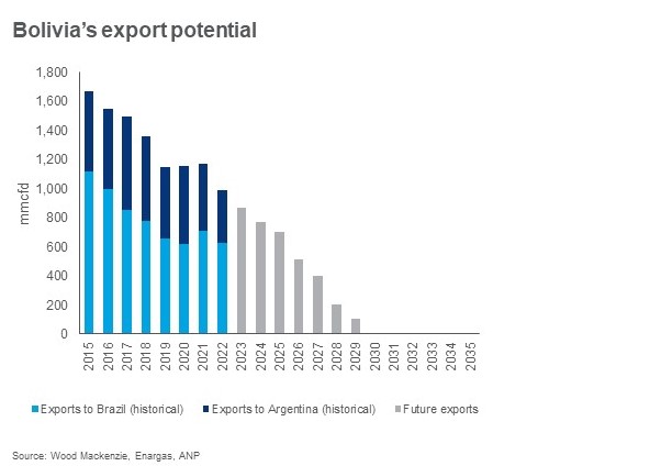 Bolivian gas production will decline more rapidly than expected, falling from 1,400 million cubic feet per day (mmcfd) in 2022 to as low as 400 mmcfd by 2030, according to a report from Wood Mackenzie, a Verisk business.